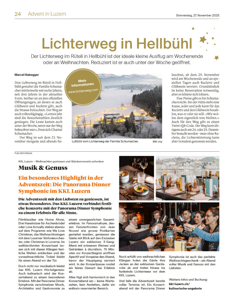 Wir freuen uns sehr über den wunderbaren Bericht in der Adventsbeilage der Luzerner Zeitung über unseren Lichterweg. Die liebevolle Darstellung unseres Projekts und die Wertschätzung unseres Engagements bedeuten uns viel.